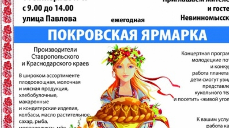 14 октября в 9:00 в Невинномысске на улице Павлова стартует ежегодная Покровская ярмарка, на которой представят свою продукцию лучшие сельхозтоваропроизводители Ставропольского края и Кубани.