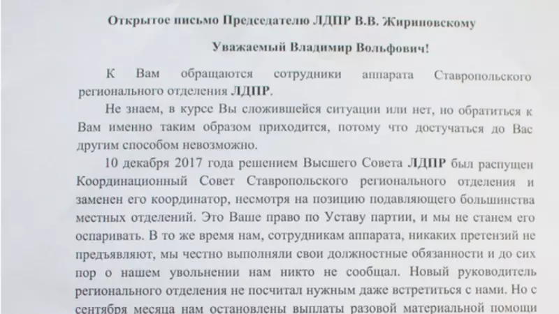 Активисты регионального аппарата ЛДПР написали письмо своему лидеру, в котором рассказали, что уже несколько месяцев не получают денег.