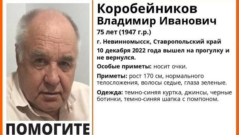 Владимир Коробейников ушёл из дома в Невинномысске 10 декабря текущего года, с этого момента о его местонахождении ничего неизвестно. К поиску подключились волонтёры регионального отряда «ЛизаАлерт». Помощь могут оказать и жители Ставропольского края.
